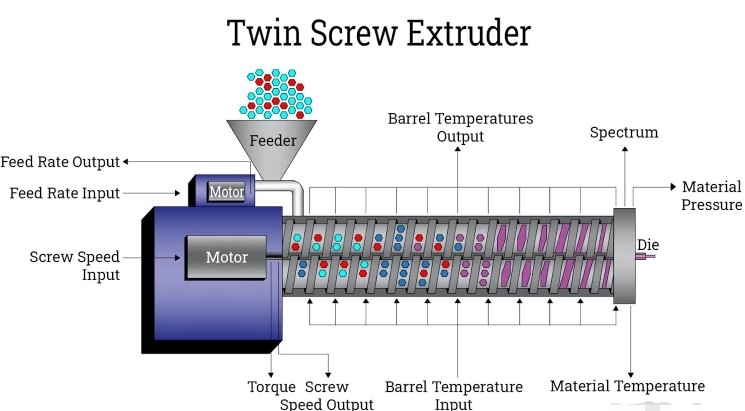 In Parallel Twin Screw, the diffusion effect between material molecules also plays an important mixing role. The rotation of the screw and the special design of the thread form a high shear and high turbulence environment in the screw groove, which accelerates the diffusion speed between material molecules and improves the mixing effect.